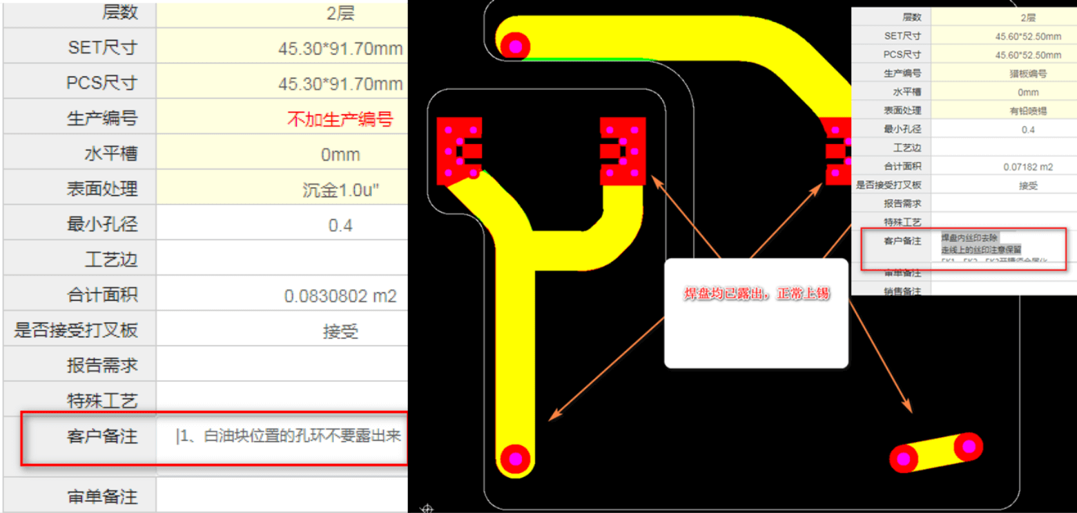 1.客户备注了白油块盖住焊盘而焊盘资料设计又是正常开窗的