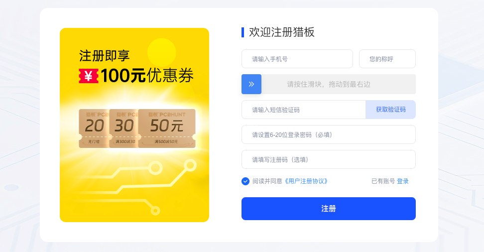 一、登录猎板官网 ,在网站右上角点击【注册】按钮二、根据提示填写注册信息,点击下方【注册】按钮提交注册信息三、账号创建成功后系统会跳转到【会员中心】,建议您根据页面提示,了解最新的营销活动!四、如有任何疑问,您可以选择您的专属客服进行联系,我们将竭诚为您服务